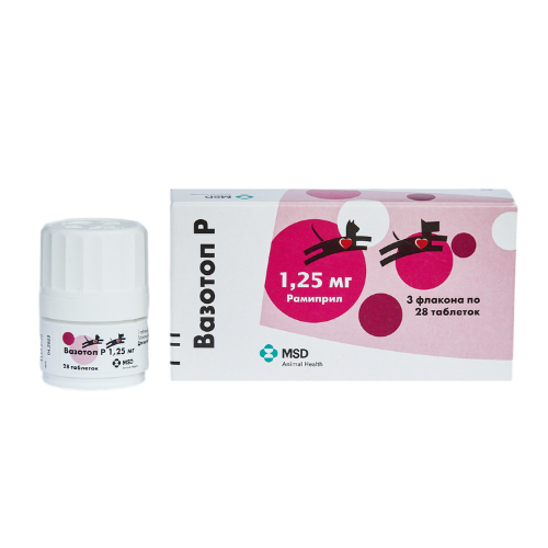 Вазотоп Р в качестве действующего вещества содержит рамиприл и вспомогательные компоненты: гипромеллоза, прежелатинизированный крахмал, микрокристаллическая целлюлоза, порошкообразный ароматизатор говядины, стеарил фумарат натрия, коллоидный ангидрид кремния и оксид железа. Представляет собой таблетки для приема внутрь, бежевого цвета продолговатой формы с бороздой посередине, с содержанием рамиприла — 1,25 мг. На каждую половину таблетки нанесено количество действующего вещества с одной стороны и с другой — латинская буква «V». Расфасовывают по 28 таблеток в пластиковые банки с влагопоглощающей мембраной и вращающейся крышкой. Упаковывают по 3 банки в картонные коробки.